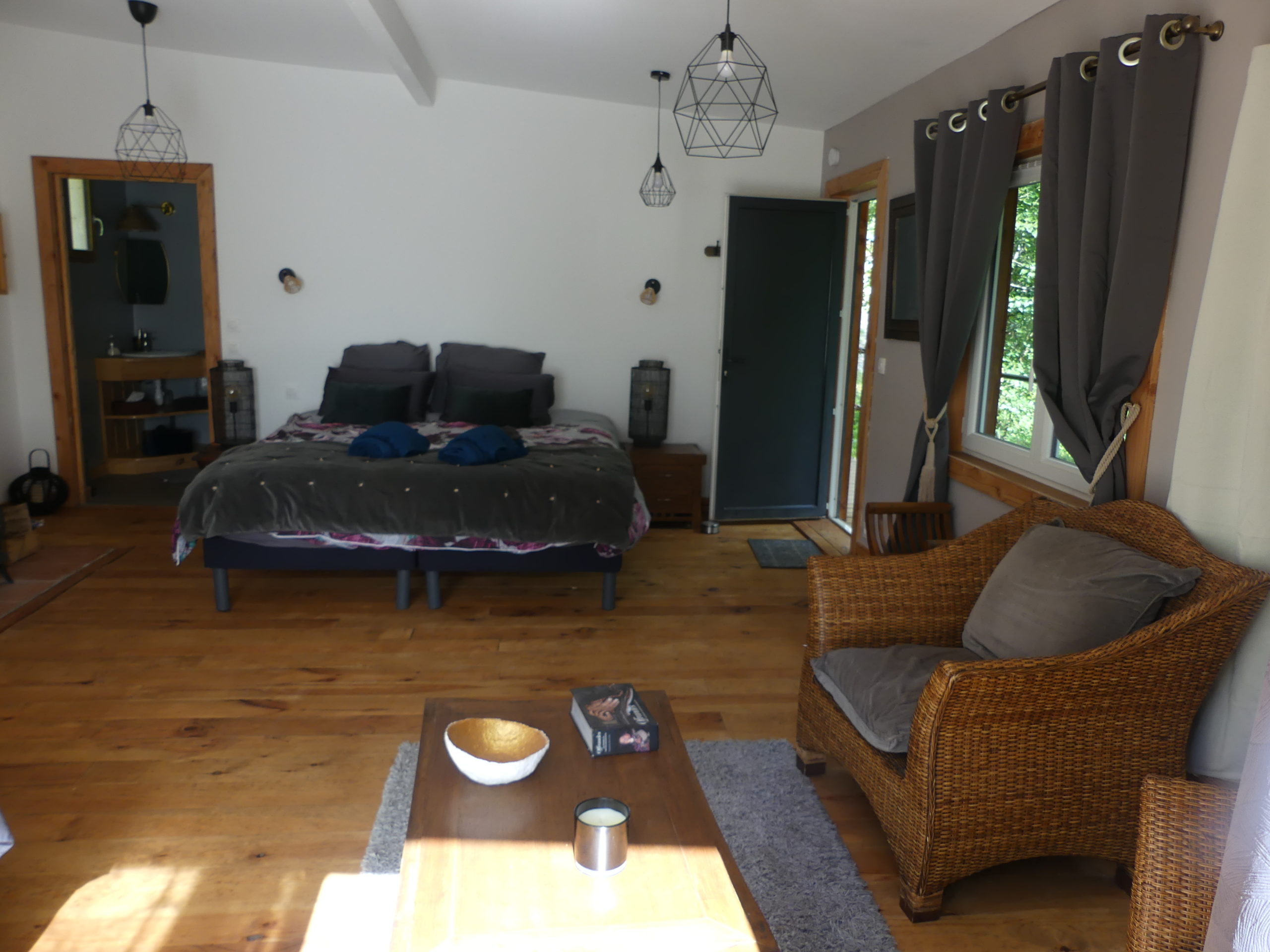 Chambre spacieuse et lumineuse avec terrasse et salon.Vue sur la nature.