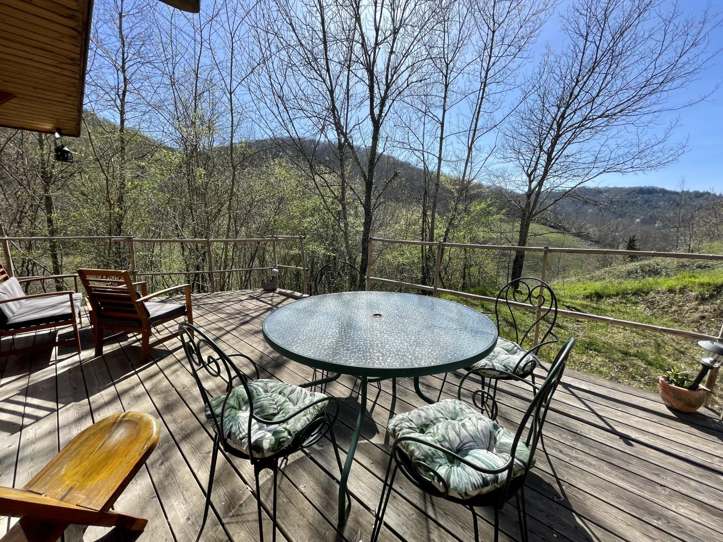 Balcon en bois avec vue, équipé d’un salon de jardin